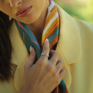 Elementi kryesor i unazës Veronica është guri zirkonia në ngjyrë të gjelbër smerald i vendosur në qendër, i prerë me kujdes dhe saktësi për shkëlqim maksimal. Dizajni minimalist dhe elegant i bazës së argjendtë të pastër krijon unazën perfekte për look-un tuaj të përditshëm.