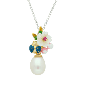 The Morning Dew Necklace reflects the freshness found in the morning dew. This sweet ornament is made of mother of pearls flower, enamel details of bright colors and cubic zirconia. The details of the teardrop pearl and the blue ladybug will give you a fresh, elegant and noble look. The Morning Dew is the perfect gift for a special person!