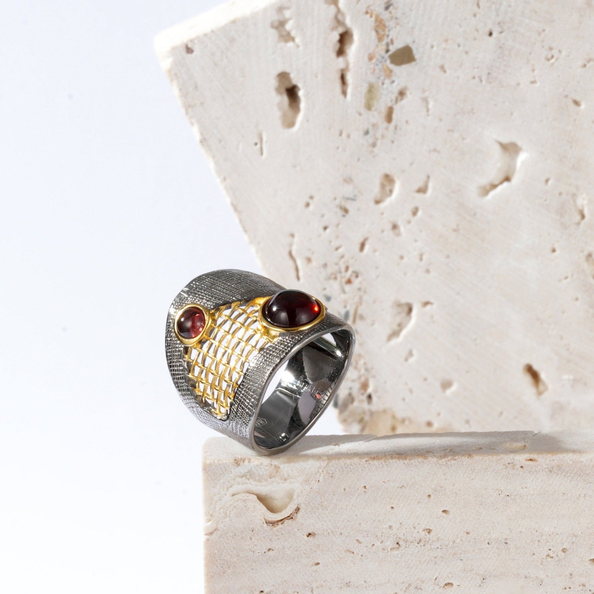 Shtojini vetes tuaj sofistikim me unazën tonë "Abyss Gold". Kjo unazë nxjerr një ndjenjë madhështie dhe luksi, me një formë që tërheq vëmendjen dhe respektin. Përshtatet lehtësisht me veshjet zyrtare dhe njëkohësisht shton një ngjyrë të sofistikimit mbretëror në rastet e përditshme. E punuar me dorë, ajo simbolizon madhështinë e gurëve natyral mbretërorë dhe joshjen e qëndrueshme të dizajnit madhështor, duke lënë një përshtypje të qëndrueshme për të gjithë ata që e shohin.