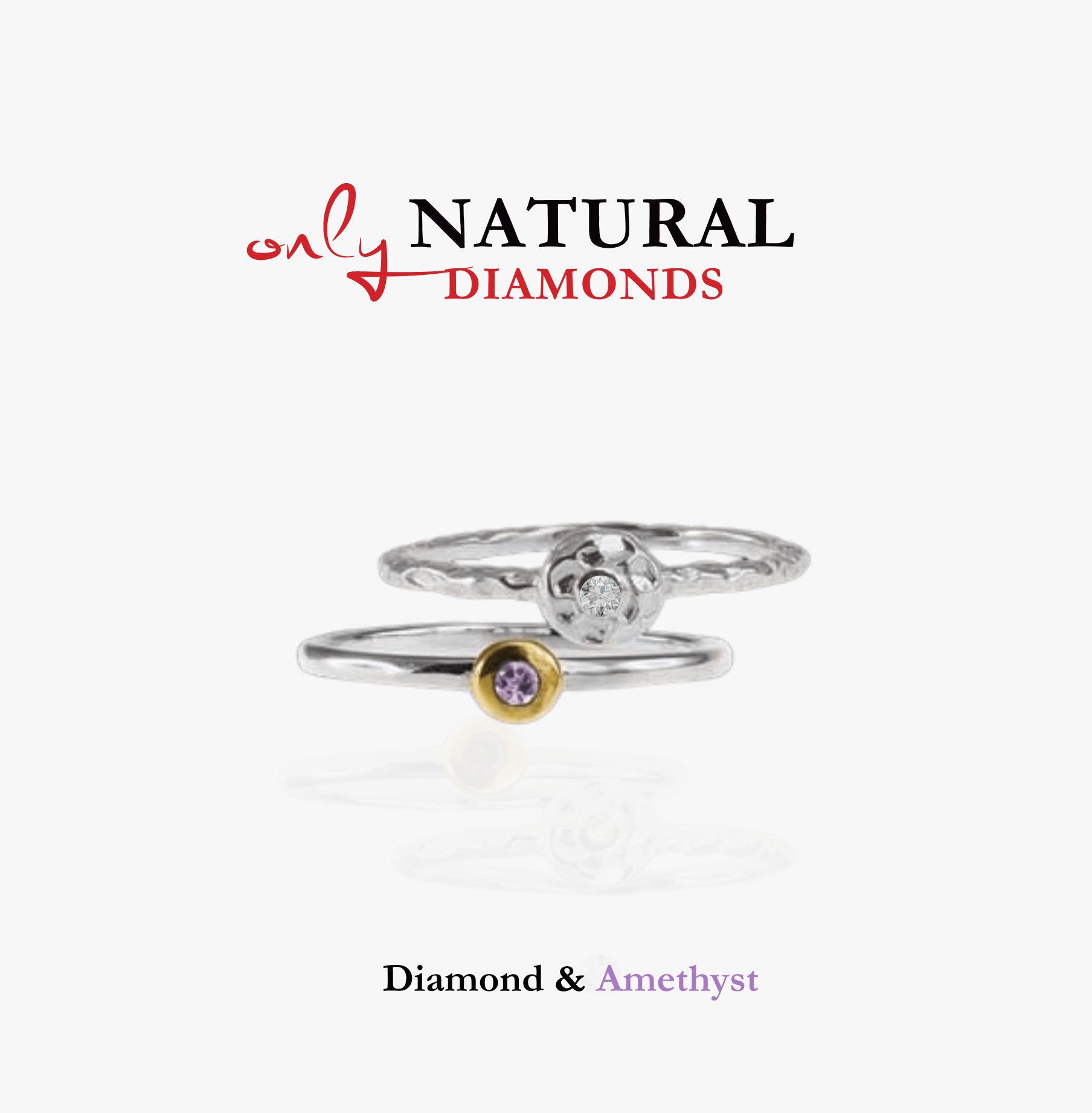 ´´Diamond & Amethyst Rings´´ një dizajn elegant me përbërje argjendi të pastër. Njëra unazë ka të vendosur në kurorën e saj një gur diamanti 1.5mm dhe tjetra një gur ametist natyral 2mm rrethuar nga një kurorë me larje ari 14K. Unazat mund të vendosen së bashku ose të ndara. Perfekte për çdo rast, këto unaza do të jenë një detaj unik dhe një dhuratë e përkryer për të lindurit e muajit Shkurt si simbol i këtij guri.