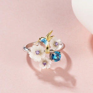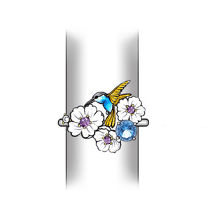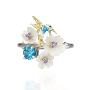 Prezantojmë unazën "Songbird Soiree", ku eleganca e natyrës dhe mjeshtëria e pasur bashkohen. E krijuar nga argjendi i hollë, i veshur me ar 14K dhe i stolisur me smalt të lyer me dorë, lule guaska delikate dhe zirkoni të shkëlqyeshëm kub, kjo unazë është një vepër arti. Dizajni i saj ngjall bukurinë e një kopshti të lulëzuar, me një zog këngëtar simpatik të vendosur në degët e tij. Ngrini stilin tuaj me këtë pjesë luksoze që ndërthur në mënyrë të përsosur joshjen e argjendit me pasurinë e arit, duke krijuar një deklaratë vërtet magjepsëse.