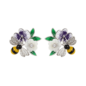 Blooming Violet Earrings from Penelope Eden Collection are the creative combination of 3 elements; white mother of pearls flower, enamel bee and enamel violet, all adorned with white cubic zirconia. These Earrings are a unique and elegant piece to bright up your collection!