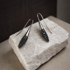 Vathë elegante për femra të punuara në Argjend 925 cilësor, të zbukuruara me kristale të zeza premium (Swarovski Elements). Dizajni modern dhe minimalist i bën perfekte për përdorim të përditshëm ose për evente speciale.
