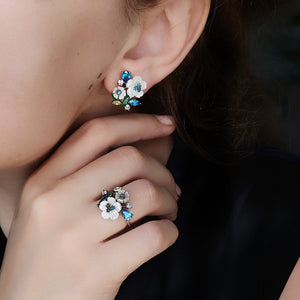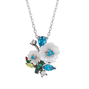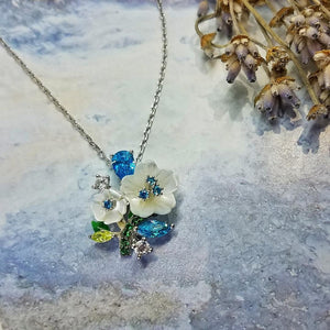 Celeste Bouquet Necklace from Penelope Eden Collection is the artistic representation of nature through white shell flowers, colorful zirconia stones and enamel leaves. These details are carefully put together to create a vibrant bouquet with cold tones of bleu celeste, white and green. A unique piece to bright up your personal collection!