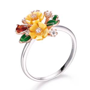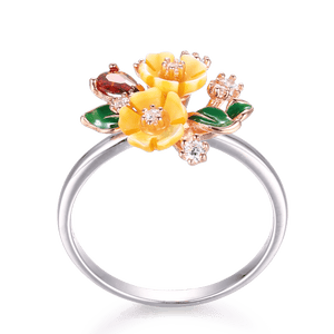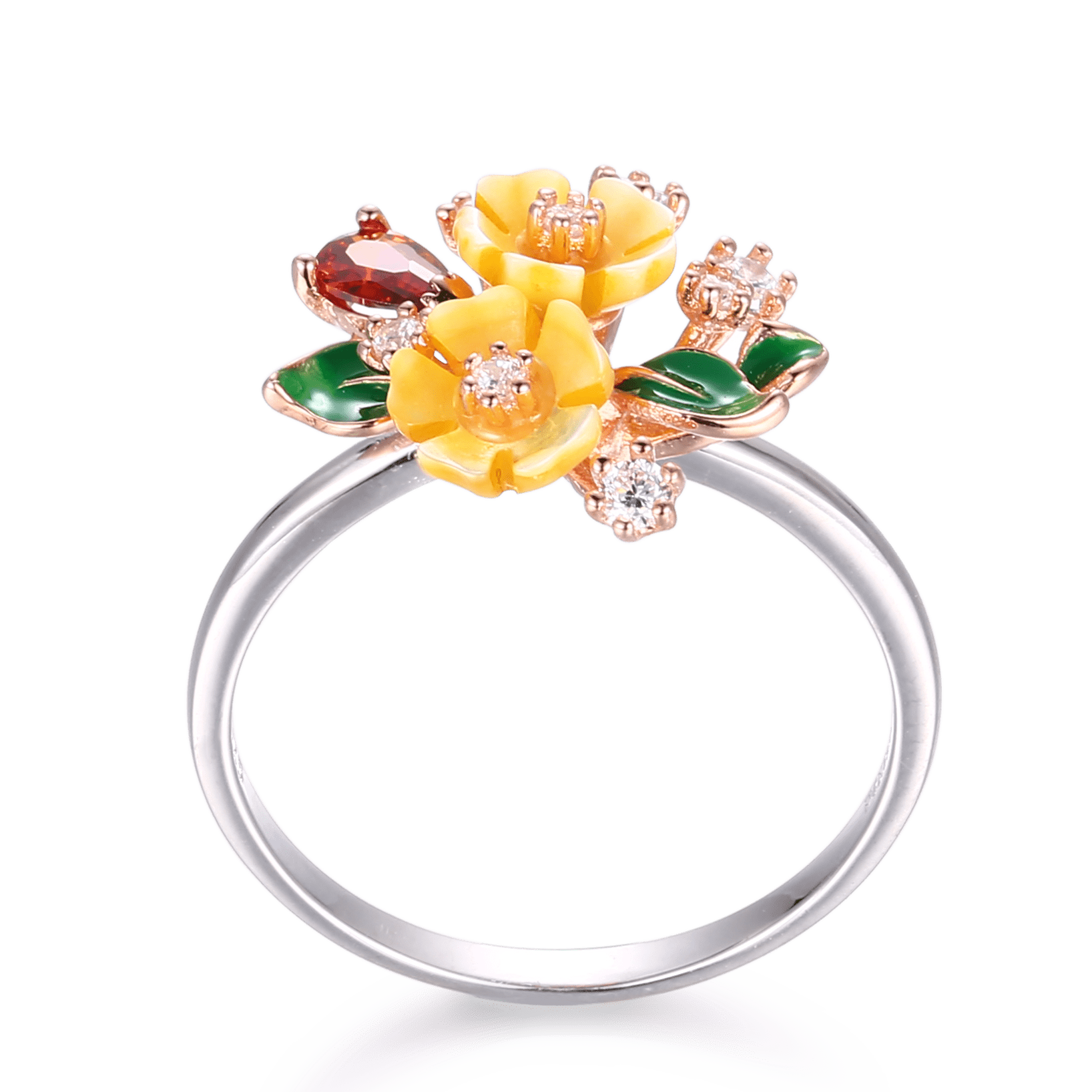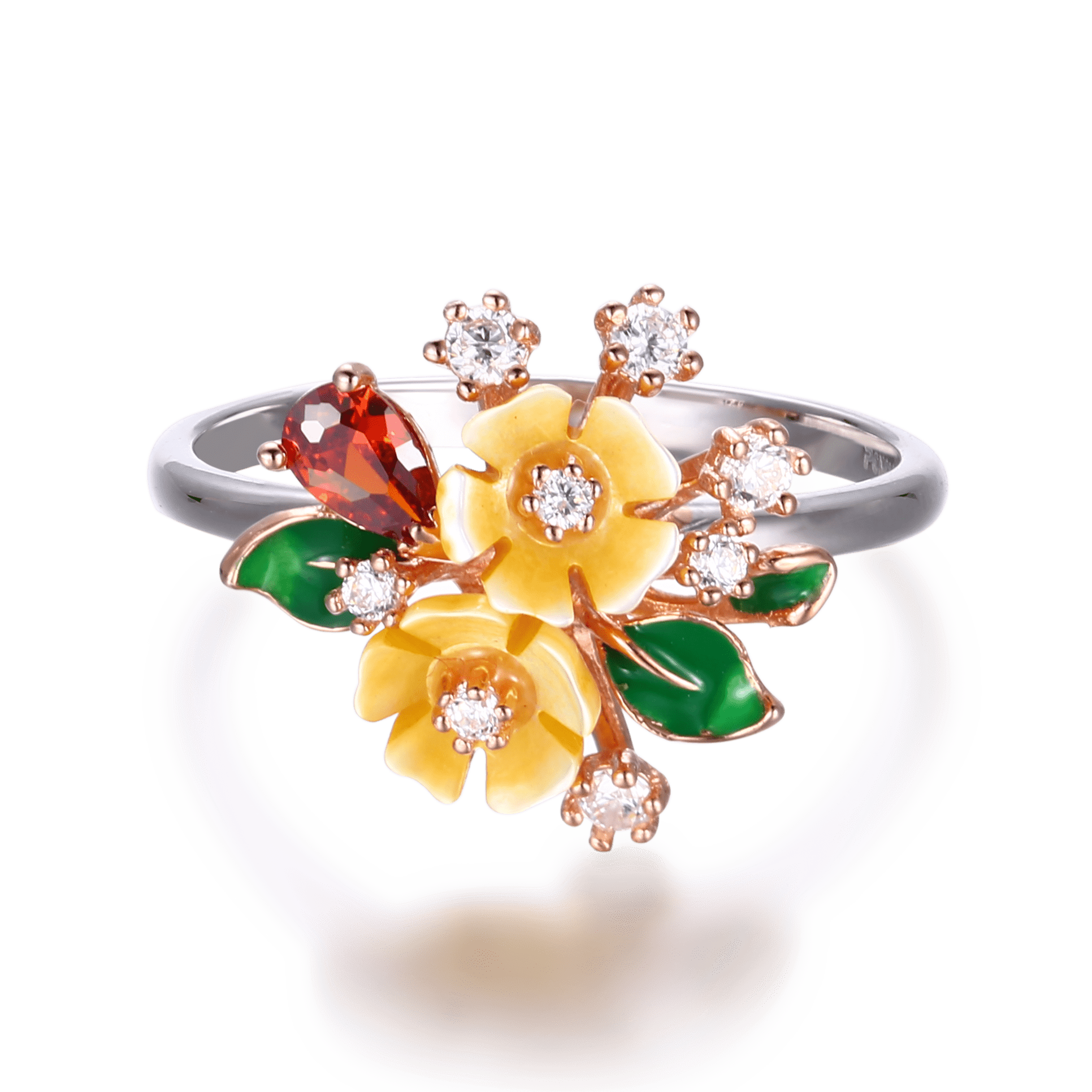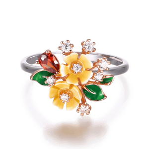 "Vera e Bardhë është një Unazë simpatike me një përzgjedhje interesante të ngjyrave. Unaza e kromuar me rodium është bërë nga lule guackash me ngjyrë të bardhë vere, gurë zirkonie të kuqe dhe të bardhë dhe detaje të gjetheve të smaltit jeshil. Shtë një pjesë elegante, tërheqëse për të kompletuar dhe ndriçuar veshjen tuaj!"
