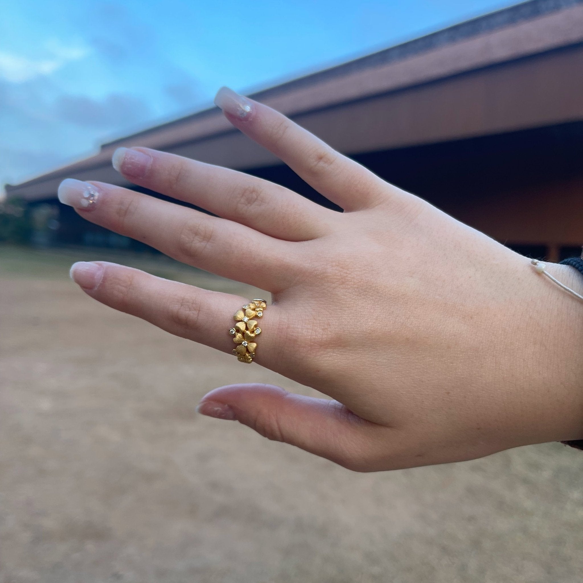 Përqafoni bukurinë e natyrës me unazën tonë të shkëlqyer "Golden Dahlia", e punuar me dorë, e veshur me ar 14K dhe e zbukuruar me shkëlqimin vezullues të gurëve të zirkonit.