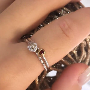 ´´Diamond & Amethyst Rings´´ një dizajn elegant me përbërje argjendi të pastër. Njëra unazë ka të vendosur në kurorën e saj një gur diamanti 1.5mm dhe tjetra një gur ametist natyral 2mm rrethuar nga një kurorë me larje ari 14K. Unazat mund të vendosen së bashku ose të ndara. Perfekte për çdo rast, këto unaza do të jenë një detaj unik dhe një dhuratë e përkryer për të lindurit e muajit Shkurt si simbol i këtij guri.