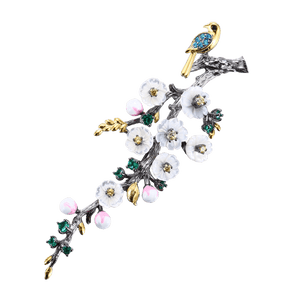 The Macaw Brooch is inspired by the Macaw parrot, the vibrant colors, the friendly and affectionate nature of the bird. The Macaw is beautifully placed on top of the brooch representing freedom and power. This magical piece extends with the black plated tree branch, white shell flowers and seedlings, green zirconia and gold leaves. This brooch of Eden Collection is also adjustable as necklace and thus the perfect gift for you!