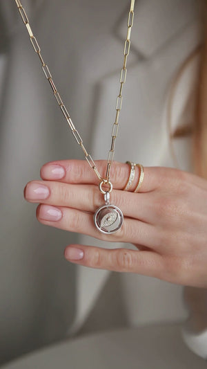 Eterna Eye Necklace është një varëse unike që kombinon elegancën me simbolikën e mbrojtjes. Epunuar me mjeshtëri në argjend 925 të veshur me ar të ngrohtë, medalioni qendror i varëses rrotullohet lehtësisht, duke zbuluar një sy mbrojtës që simbolizon fuqinë për të larguar energjitë negative dhe për të sjellë fat të mirë. Ky aksesor i sofistikuar është perfekt për raste të veçanta dhe për veshje të përditshme, duke i dhënë një prekje të veçantë stilit tuaj.
