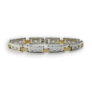 Byzylyk për meshkuj prej çeliku 100% anti alergjik. I punuar me kujdes me hallka të ndërlidhura me mjeshtëri në ngjyrë argjendi dhe floriri, byzylyku Max është aksesori elegant që do të qëndrojë bukur me çdo veshje tuajën.