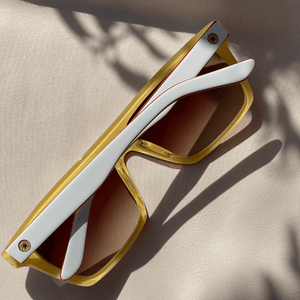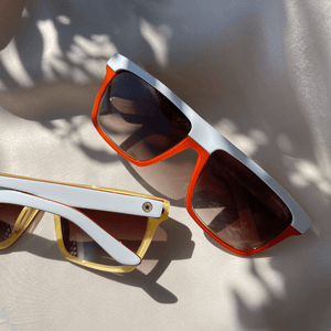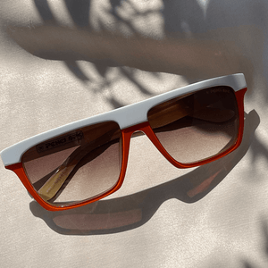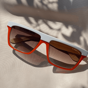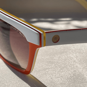 Penelope Playcolor collection in wayfarer style. The frame color in white and orange makes them fit perfectly for oval, heart and round face shapes. This pair is an unisex style, so you can make e combination with the other shades and colors of Playcolor collection to wear them with your boy/girlfriend .