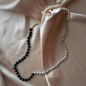 Shadow Pearl Necklace është një gjerdan unikal që bashkon tonalitetet delikate dhe misterioze të perlave të bardha, gri dhe të zeza të ujit të ëmbël. Përmasat e perlave, që variojnë nga 6 mm deri në 9 mm, dhe gjatësi e përgjithshme prej 65 cm, e bëjnë këtë gjerdan një aksesor të përkryer për çdo stil dhe rast.